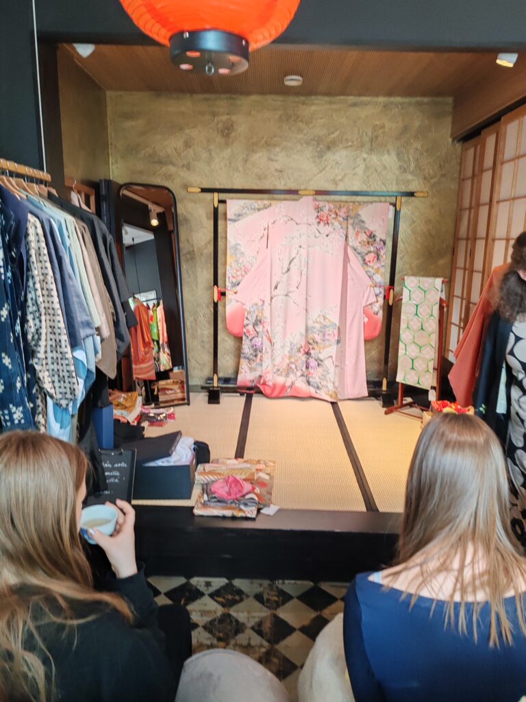 Sossens japanska klubb på teceremoni och kimonoprövning i Tabi-butiken på Sirkkalagatan i Åbo i maj 2025